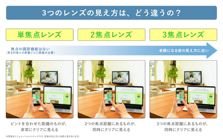 多焦点眼内レンズは100%の患者様が眼鏡が不要になるというレンズではありません。ご自身のライフスタイルに合わせた見える焦点(ポイント)を増やすことで、眼鏡の依存度を減らし、術後のQOV*を高めるレンズです。
