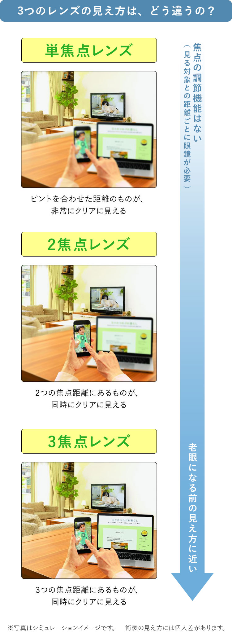(2)多焦点眼内レンズ:遠方と近方、レンズの種類によっては中間にもピントが合うため、眼鏡の依存度を減らすことができます。当院では自由診療、選定療養のどちらにも対応しております。詳細につきましては、医師・スタッフにお問い合わせください。