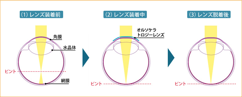 就寝時に専用レンズを装用することで、特殊な内面カーブが角膜前面の形状を変化させ、扁平化することにより焦点が網膜上で結ばれ、像がはっきり見えます。